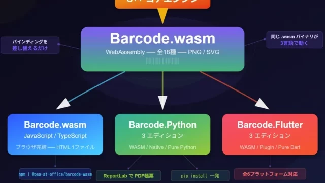 有限会社パオ・アット・オフィスは、C++エンジンを基盤とするWebAssembly版「Barcode.wasm」を中心に、Python、Flutter、Go、Rust、Ruby、Swift向けのバーコード生成ライブラリ計7製品を2026年2月25日に一斉リリースしました。これにより、様々な開発プラットフォームをカバーするバーコード生成ソリューションが提供されます。